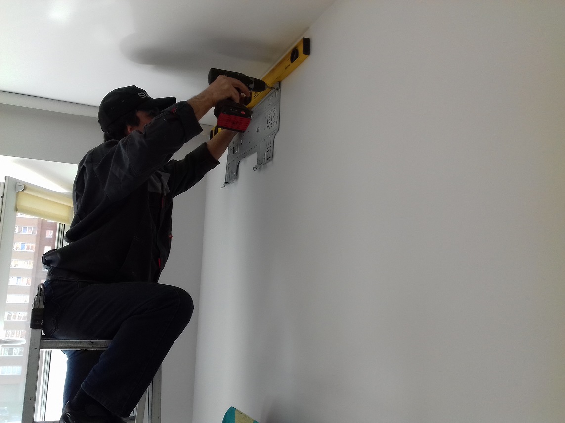 Сначала крепятся кронштейны к стене. В зависимости от фасада дома и массы наружного блока используются разные кронштейны. Они могут быть следующих размеров: 450х450 или 750х500. Очень тяжелые наружные блоки размещаются на специально собранные подставки или на твердую поверхность (крыша, земля). Обычно наружный блок размещается под окном - это самый простой способ. Если нет возможности выставить наружный блок из окна или установить с лестницы, то потребуется помощь промышленного альпиниста или автовышки. Но нужно учитывать, что в дальнейшем при обслуживание кондиционера или ремонте каждый раз необходимы будут услуги промышленного альпиниста или автовышки. - Установка внутреннего блока