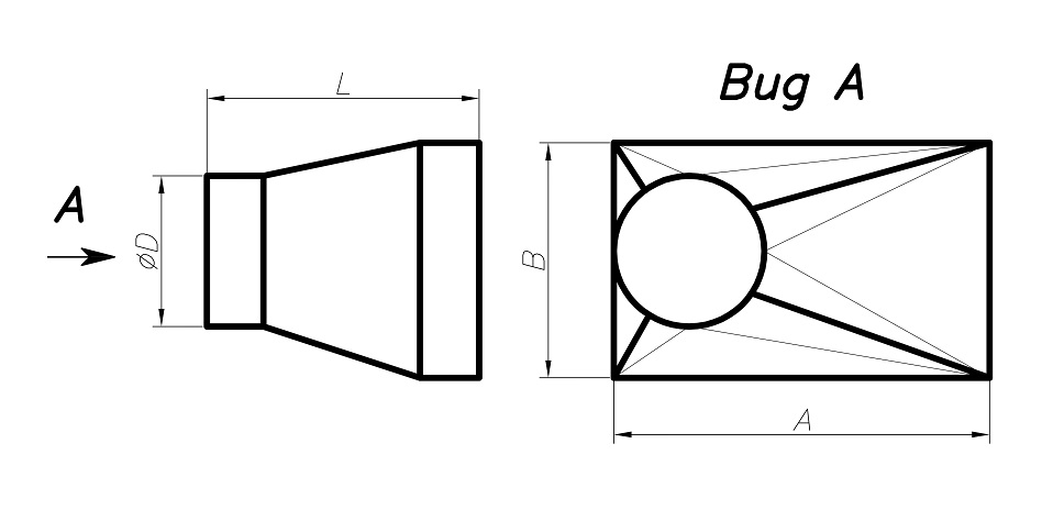 Данный переход стыкует прямоугольные воздуховоды с круглыми. Смещение является односторонним левым.